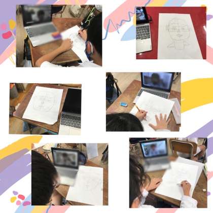 ? お話の世界が終わり、今度は木版画に挑戦です。まずは、タブレットで写真を撮り、じっくり観察しました。つぎに、輪郭から順に描いていきます。「こんな顔ちゃう!」「いい感じになってきた!」など、じっくり見るとさまざまな発見があったようです。素敵な下絵ができあがりました。