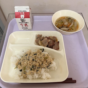 ごはん、牛乳、豚肉のスタミナ焼き、すまし汁、とりなっ葉いため