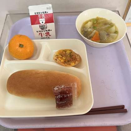 コッペパン、牛乳、豚肉と野菜のスープ煮、変わりピザ、みかん、いちごジャム