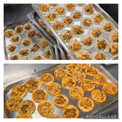 「変わりピザ」は、ぎょうざの皮に、ツナ、コーン、ピーマン、ピザソース、チーズを混ぜ合わせた具をのせ、焼き物機で焼いています。