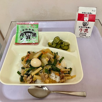 牛乳、中華丼、きゅうりのピリ辛あえ、ソフト黒豆