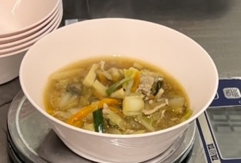中華丼は、うずら卵を除去した個別対応献立も提供しています。除去食では、ピンクの食器を使用しています。