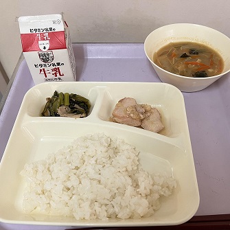 ごはん、牛乳、鶏肉のおろしじょうゆかけ、みそ汁、こまつなのいためもの