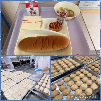 「とうふハンバーグ」は、とうふ、ツナ缶、玉ねぎを、しょうゆなどの調味料と混ぜ合わせています。調理員さんがひとつずつ手作業で作っています。子ども達に人気の献立です!(^^)!