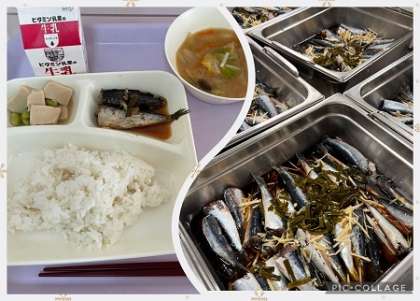 ごはん、牛乳、いわしのしょうが煮、みそ汁、高野どうふの煮もの