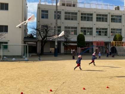 今日も桜宮幼稚園の子たちが凧上げをやりに学校へ遊びに来ました。今日は3.4歳児の子たちと一緒に保護者の方も来てくださいました。
