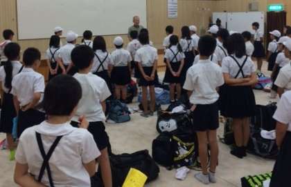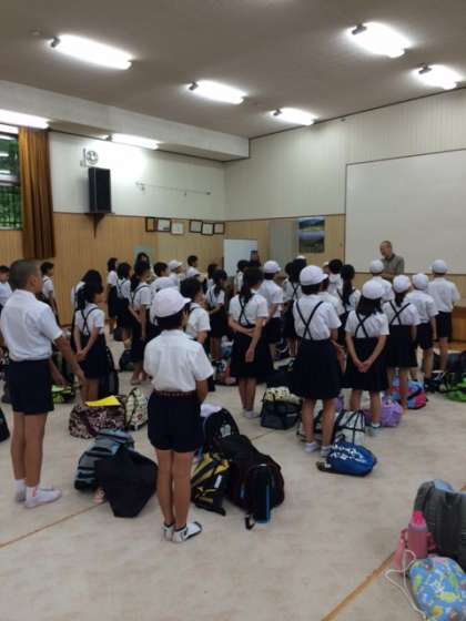 林間学習1日目 バスは定刻に宿舎に到着しました。参加者はみな元気です。しかし、現地はあいにくの雨。宿舎の大広間で開舎式をしました。このあと昼食の弁当をいただきます。