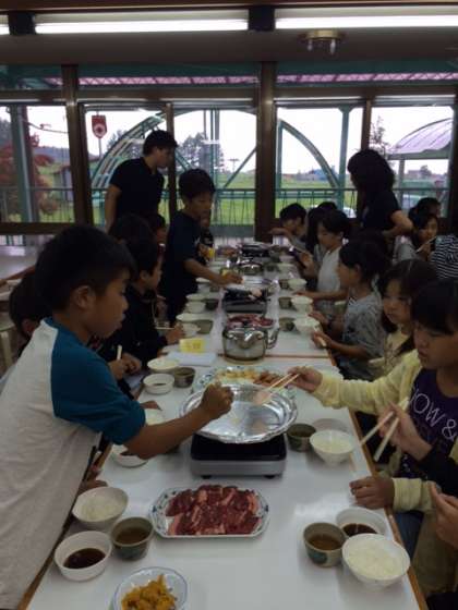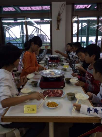 1日目の夕食は焼肉!みんな、肉が早く焼けないか、何回もひっくり返して、確認してます。肉はあっという間に減っていきますが…野菜が…。活動でおなかもすいていたので、みんなでおいしくいただきました。