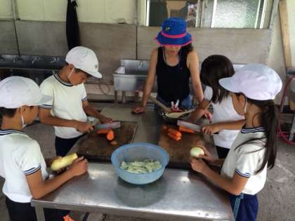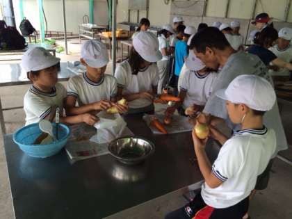 飯ごう炊さんスタート!普段とは違い、お釜でご飯を炊くのは難しいですね。みんな、宿の方の話をしっかり聞き、手順もばっちりです。さぁ、美味しくご飯が炊けるか楽しみです。