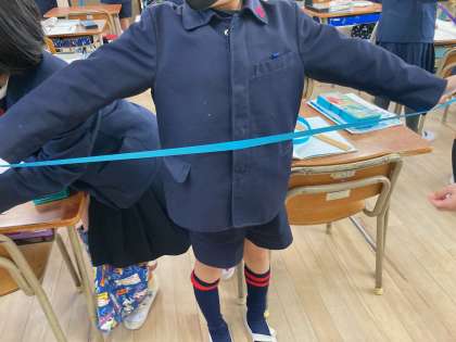 算数科「長い長さ」の学習で、自分の両手を広げた長さを紙テープを使って調べました。そして、測りとったテープの長さを30cmいくつ分かであらわしました。