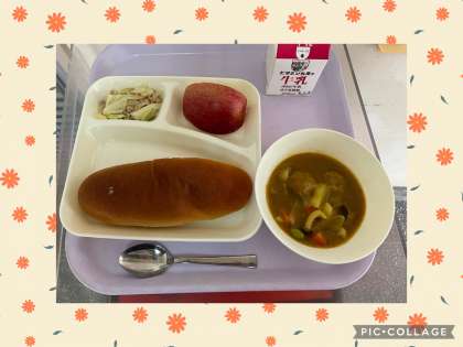 黒糖パン、牛乳、ミートボールと野菜のカレー煮、ツナとキャベツのソテー、りんご