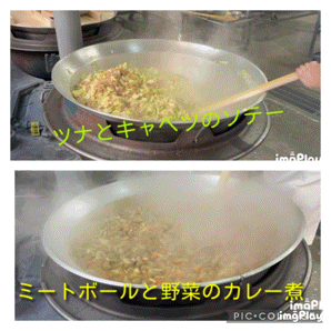 動画は給食室で作っている様子です。スパテラという大きなヘラで混ぜています。またカレー煮は、できるだけ温かい状態で食べることができるように、配缶時間を調整して作ってくださっています。りんごは、長野県産サンふじです。旬の果物は、甘くジューシーでした。