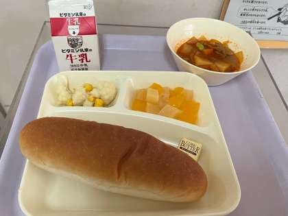コッペパン、牛乳、豚肉と野菜のケチャップ煮、カリフラワーのピクルス、フルーツゼリー、バター
