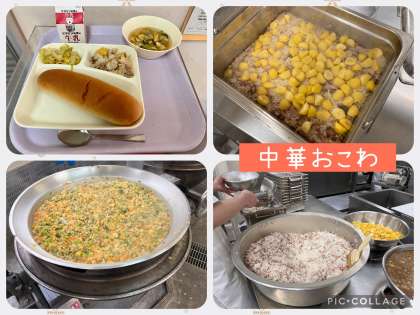 中華おこわは、もち米、くり、しいたけ、焼き豚、調味料を入れて、蒸し焼きにして作っています。もちもちとした食感で人気の献立です!