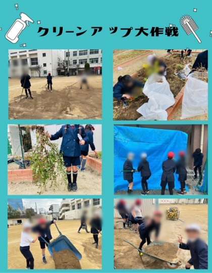 クリーンアップでは、運動場の土入れやブルーシート洗い、学習園の草引きをしました。
