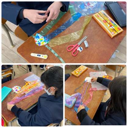 図工では、国語で学習している「スイミー」のお話に出てくる虹色のくらげを作りました。スズランテープで足を作り、カラフルなくらげができました♪