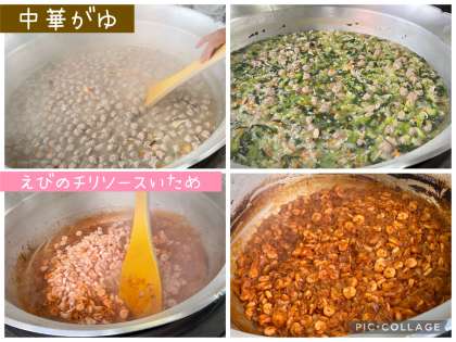 米を多めの水でやわらかく煮た料理を「かゆ」といい、中華がゆは、味のついたスープで米を煮て作ります。給食の中華がゆは、米のほかに、肉だんご、だいこん、チンゲンサイ、にんじん、しいたけを加えて作ります。塩、うすくちしょうゆ、チキンブイヨンで味つけし、仕上げにごま油で風味をつけています。