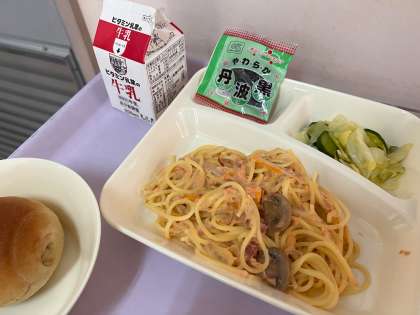 給食では、スパゲッティ以外にも、エルボやツイストなどのパスタも使っています。