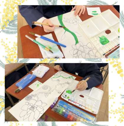 図工科では、前回に描いていた作品に色をつけていきました。