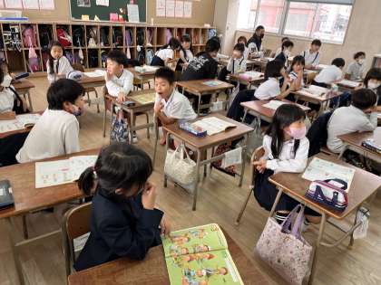 今日の外国語の授業では、前回よりレベルアップをした挨拶に挑戦しました。