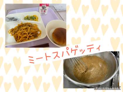ミートソーススパゲッティは、ルゥを手作りしています。とても美味しくて大人気です^_^献立表に作り方を載せていますので、ぜひご参考ください♪