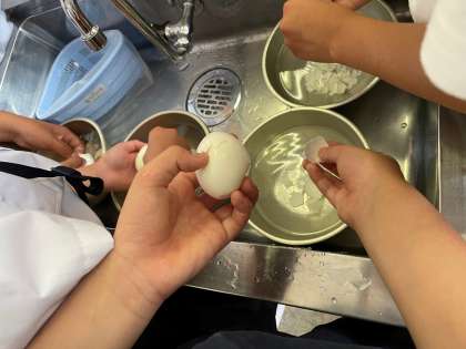 家庭科でたまごを茹でました。茹でる時間によって出来栄えが違いましたね!綺麗に殻を剝きました(^^)/