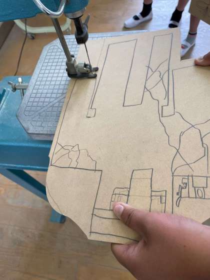 5年生の図工科の様子です。電動糸のこぎりをなどを使って白板を作っています!真っすぐ切るのが難しかったようです( 一一)