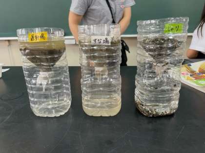 4年生の理科では、雨水のゆくえと地面の様子について学習しています。運動場、すな場、じゃりでは水の染み込み方にどのようなちがいがあるのかを学習しました。水の染み込み方のちがいに子どもたちはとても驚いていました!