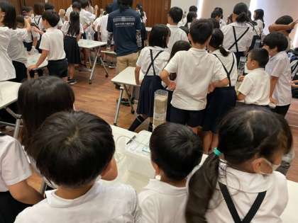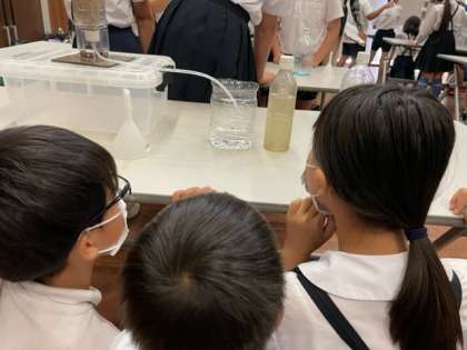 淀川の水がどれだけ綺麗になるのか、子どもたちは綺麗になる水を見て「すごい!!」「めっちゃきれい!」と水が綺麗になるまでの仕組みがわかり、とても驚いていました。