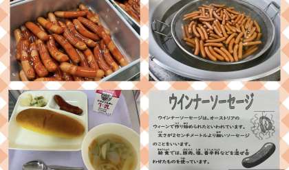 給食では、豚肉、塩、香辛料などを混ぜ合わせたものを使っています。ちなみに、フランクフルト、ボロニア、ウィンナーは太さの違いで名前が変わりますが全てソーセージです。