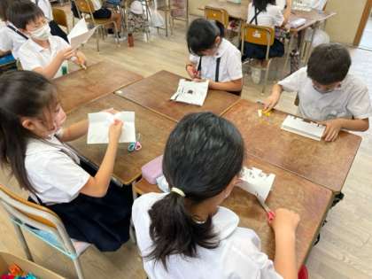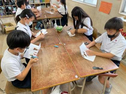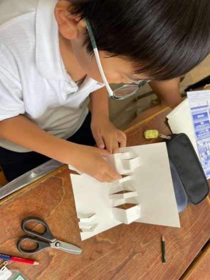 4年生は図画工作科の学習で、一枚の画用紙からオブジェを製作していきました。「どのように切ると面白いかな?」「こうしたらどうなるんだろう。」などと考え、楽しみながら学習に取り組んでいました!
