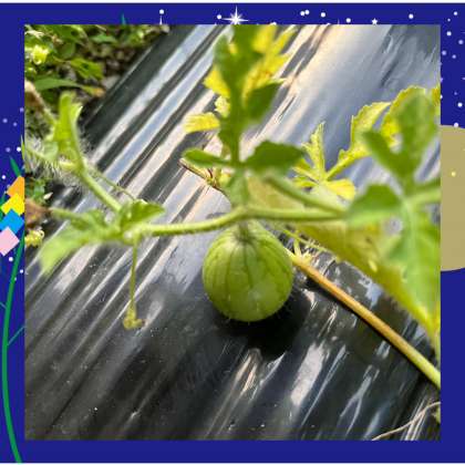 みずやり係の子どもたちが学習園で育てているスイカが少し大きくなっていると教えてくれました。