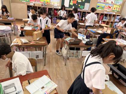 図工科の学習では、ダンボールを使って立体作品を作っています。何が出来上がるのか楽しみですね!