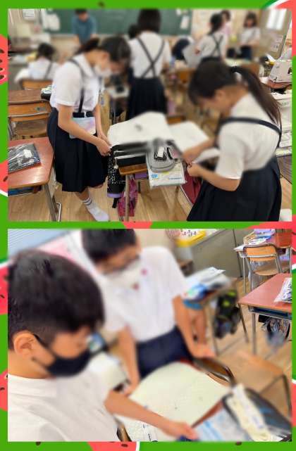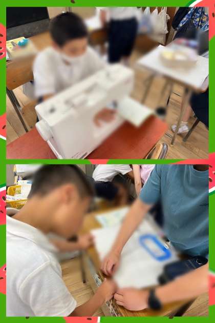 家庭科では、前回に印をつけたところをミシンで縫い始めました。縫う前に友だちと向きを確認したり、交代でミシンを使ったりして協力して作る様子が見られました^ ^