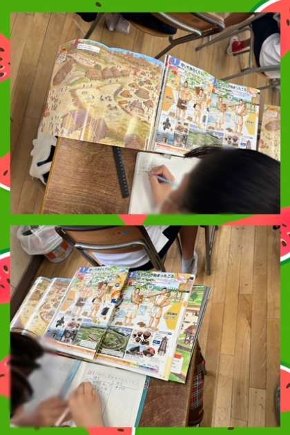 社会科では、縄文時代と弥生時代の違いについて調べました。くらしや食べ物、道具など、資料をじっくり見るとたくさんの気づきがあったようです。