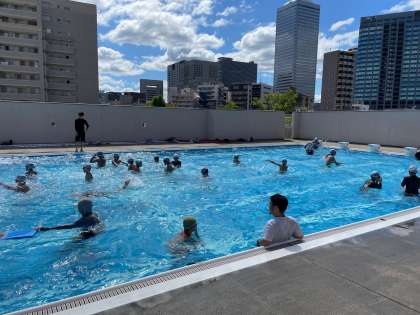 ただいま5.6年生が入水しています。多くの子どもたち参加しています。天気も良くみんな気持ちよさそうに泳いでいます!