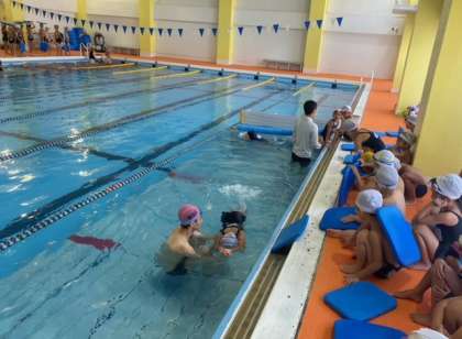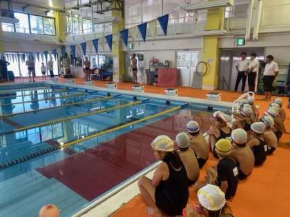 今日、1年生、2年生で桜宮スイミングスクールに行き、水泳学習をしました。5つのグループにわかれ、スクールのコーチの方たちが教えてくださいました。