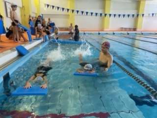 伏し浮きやビート板を使った泳ぎ方など、ていねいに教えていただきました。子どもたちも「めっちゃ楽しかった」「また教えてほしい」と話をしていました。とても貴重な経験ができましたね。