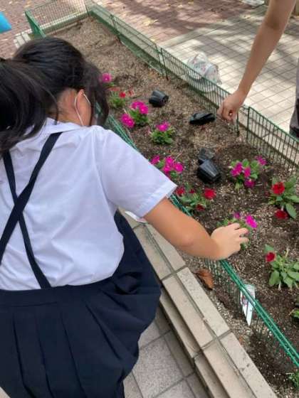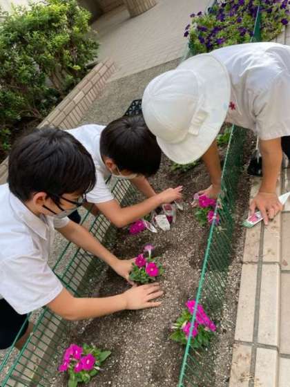 環境委員会では、正門の前の花壇に赤、ピンクの新しい花を植えました。暑い日が続きますが、みんなで水やり頑張ります!!