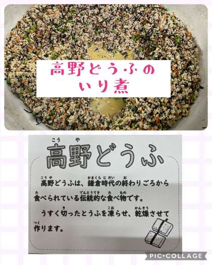 高野どうふは、鎌倉時代の終わりごろから食べられている伝統的な食べ物です。うすく切ったとうふを凍らせ、乾燥させて作ります。今日の給食では、高野どうふを粉末にした粉どうふを使っています。栄養価は、植物性のたんぱく質と脂質が含まれ、高たんぱく低脂質の食材です。カルシウムやカリウム、鉄分も含まれるので、子ども達にぜひ食べてほしい食材の一つです(^^)