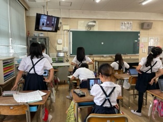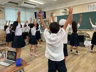 1人一台端末を使ってラジオ体操の見本動画を見ながら、ラジオ体操の練習をしました。「ここのびる!」「ぴしっ!」などと言いながらカッコよくラジオ体操をすることができました。