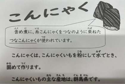 今日の給食放送では、こんにゃくについて紹介しました。給食放送でも出したクイズ紹介します。ぜひ、ご家庭でも出してみてください♪みんな、クイズの答え覚えているかなぁ?