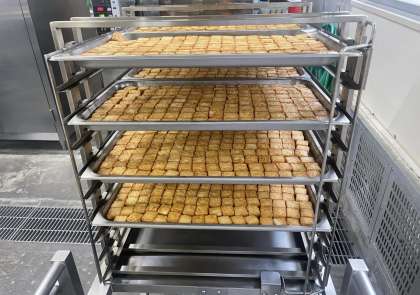 厚揚げはホテルパンという名前の鉄板に、手作業で一つずつ並べて焼いています。1人あたり約3個なので小学校分でおよそ1400個の一口サイズのあつあげを並べています。