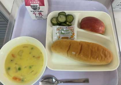シチューは小麦粉アレルギーの児童も食べられるよう、小麦粉の代わりに、米粉(上新粉)でとろみをつけています。また牛乳の代わりに豆乳を使い、乳アレルギーの児童も食べられる献立になっています。りんごは、ジョナゴールドという品種が産地から届きました!