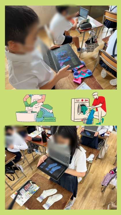 ?洗濯物が乾いたら、洗い上がりの違いを比較しました。「しっかり汚れが落ちていない!」「あれ?少し縮んでいる?」など、じっくり見比べるとさまざまな発見があったようです。こちらも撮影した後にレポートで提出です。
