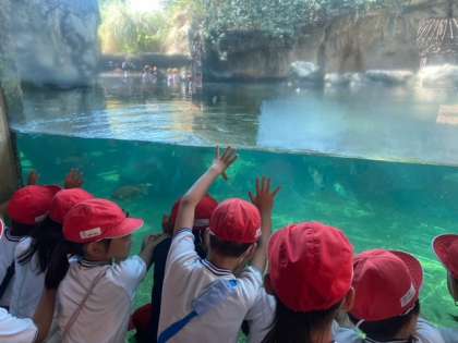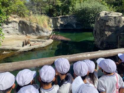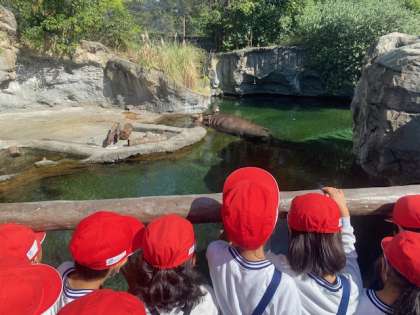 カバがいるエリアです。とても大きなカバが朝から気持ちよさそうに水浴びをしていました。カバの大きさ、迫力にみんなも大興奮ですね。