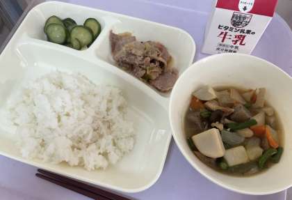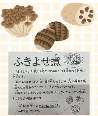 「ふきよせ」は秋から冬のはじめにかけて使われる料理の名前です。風にふきよせられた落ち葉を思わせられるように、秋の味覚を盛り合わせたもののことを、「ふきよせ煮」といいます。秋にたくさんとれておいしくなる、くり、ぎんなん、いも、野菜、きのこなどが使われます。今日の給食では、さといも、れんこん、しめじを使っています。