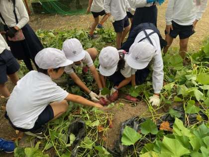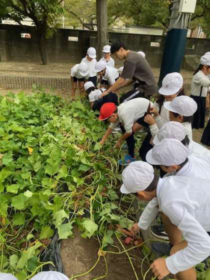 今日の5時間目の生活科の時間に、学習園に植えてあったさつまいもを掘りました。土の中から大きな芋をたくさん掘り出すことができました。