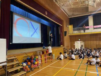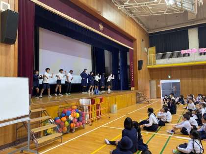 ふれあい集会ではジャンケン列車やボール送りリレー、クイズをして楽しみました。クイズは先生クイズで、出された課題をその先生が一回でクリアできるかのマルバツクイズでした。いろいろな先生が挑戦するたびにとても盛り上がりましたね。
