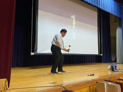 ちなみに校長先生への課題は「けん玉の玉を一発でけん先に入れられるか」でした。そして、見事成功!!最高の盛り上がりでした。